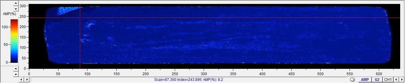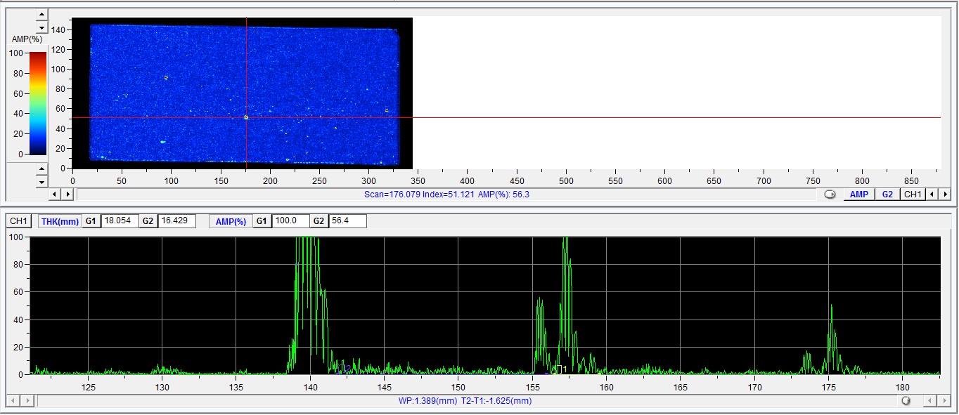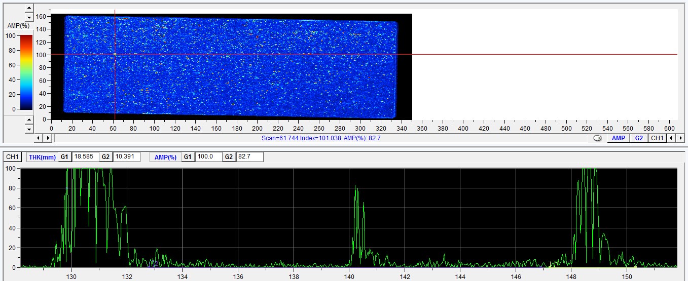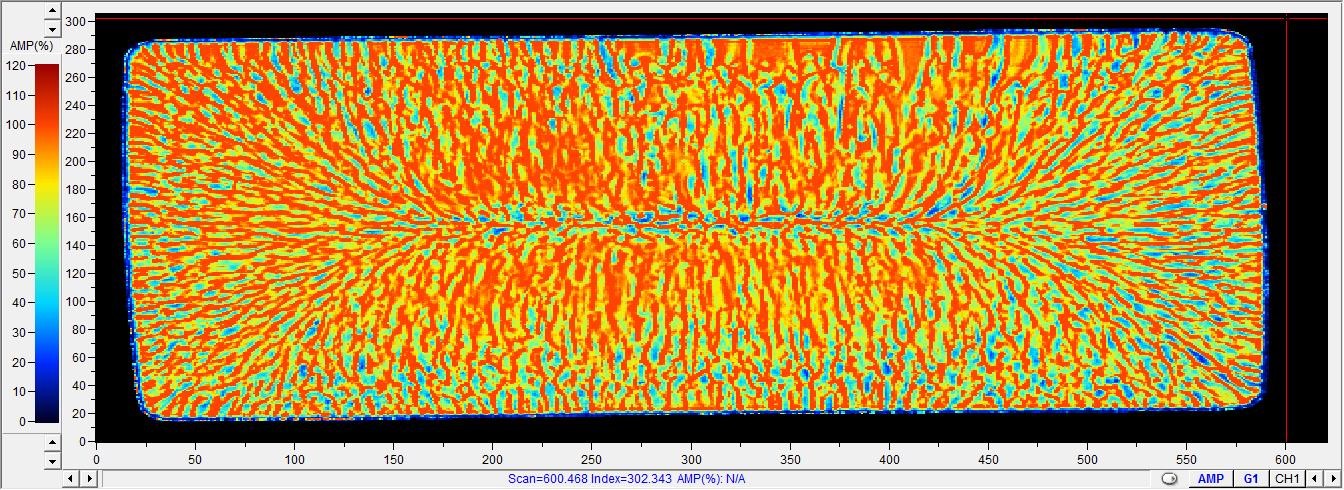 其中,編号140227-101和編号151002001-1的掃描結果中,觀察缺陷波成(chéng)像,未見明顯超出标準的缺陷,但是觀察底波成(chéng)像,發(fā)現兩(liǎng)塊樣(yàng)品的底波都(dōu)存在局部的大幅度衰減,通過(guò)底波衰減形成(chéng)的圖像,具有典型的規律化圖像。
