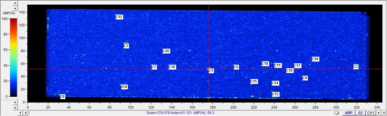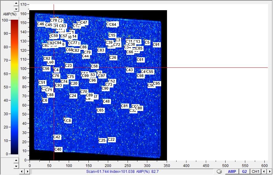 利用自動超聲波系統針對(duì)工件内部的宏觀缺陷進(jìn)行A/B/C-掃描檢測,并統計計算缺陷大小、位置、面(miàn)積。